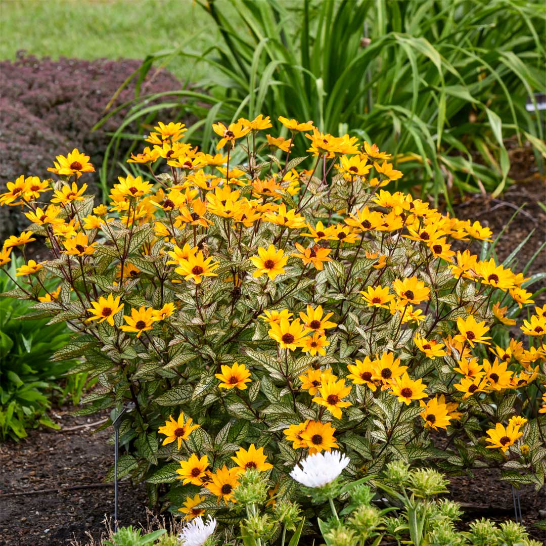 Cet héliopsis présente des fleurs semi-doubles jaunes portant des pétales qui se chevauchent. Son feuillage vert est fortement marginé de blanc. Les tiges et les feuilles sont teintées de rose rouge lui apportant une coloration exceptionnelle. Plante pollinisatrice, elle est idéale pour les abeilles et les papillons. Son port buissonnant est bien ramifié. Semble moins affecté par le blanc (l’oïdium) que les variétés traditionnelles.